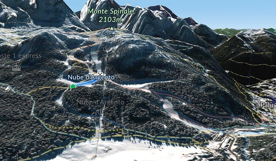 Nowa linia łączy okolice Montagnoli (ok. 1 651 m) ze stacją górną w rejonie ok. 1 801 m, w samym sercu sieci tras po stronie Spinale. Z góry łatwo wpiąć się w zjazdy Nube d’Argento / Nube d’Oro i dalej w kierunku Spinale lub 5 Laghi.